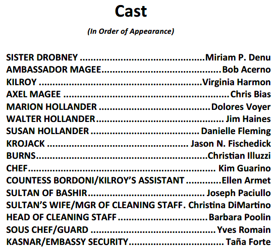 BOB ACERNO (Ambassador Magee) has known the founders of Maggie’s Little Theatre since his early days in Community Theatre… then life happened. Now retired, he is very glad to be a part of the group. Before the hiatus, Bob performed in theaters throughout Queens, including as Commander Harbison in South Pacific, Billy Ladnier in Standard Deviation, Fedele in Death Takes a Holiday, and the 2nd Delivery Man in No Sex Please, We’re British. (“Just when I get out, they pull me back in”… LOL!)